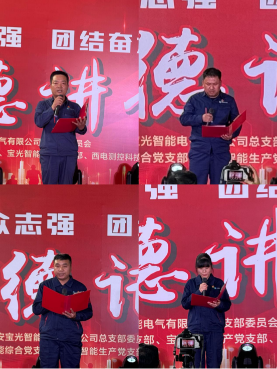 本次道德讲堂围绕唱歌曲、学模范、做承诺、诵经典、送祝福、做总结六个板块展开,大家一起欣赏了开场合唱《明天会更好》、女声独唱《灯火里的中国》、西电测控独唱《我和我的祖国》等歌曲;聆听了展现企业发展历程的《薪火相传、共筑荣光》、讲述营销处廉洁合规故事《道德的光芒》、表现库房日常工作的《方寸间的信仰》等爱企爱国的感人诵读;观看了综合办根据清欠工作原创小品《清欠》、配套事业部班组协作小品《团结的力量》等反映基层一线的精彩故事;还有物流处、成套事业部、质检处根据自身岗位特点编排的舞蹈《敬业者联盟》、《我们都是追梦人》、手势舞《勇往直前》等节目;期间宝光智能四位优秀党员上台做分享发言。营销、生产、设计、物流的部门负责人在现场做出了廉洁承诺。